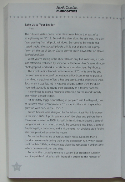 Unlike other books in the "Curiosities" series that feature small "Futuro" articles this one does actually add a little history to the "knowledge pool" and so has some value in addition to being a "collector's piece". It would also be a useful book when planning a North Carolina vacation.
