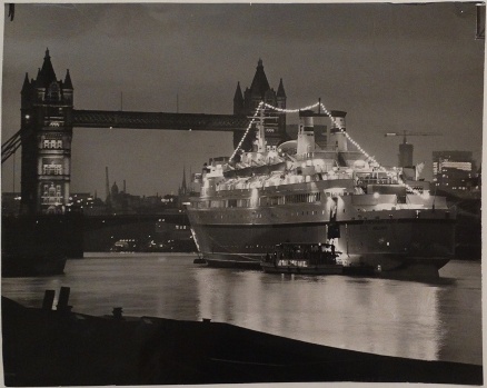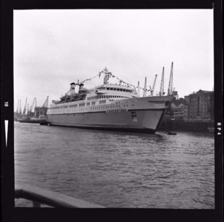The Finnfocus Export Fair of October 1968 took place in London. The event was designed to showcase Finnish design and was hosted on the ferry Finnpartner. The Finnpartner was moored on the Thames close to Tower Bridge for the exhibition. Futuro #002, now located in Matsalu, Estonia was was one of the exhibits at the Fair; in fact one of the most iconic of all Futuro photographs was taken at this event. That photograph was an external shot of the Futuro with Tower Bridge in the background; we have an original press copy of that photograph in this collection here along with a RPPC and a poster print both showing the Finnpartner with Futuro onboard.