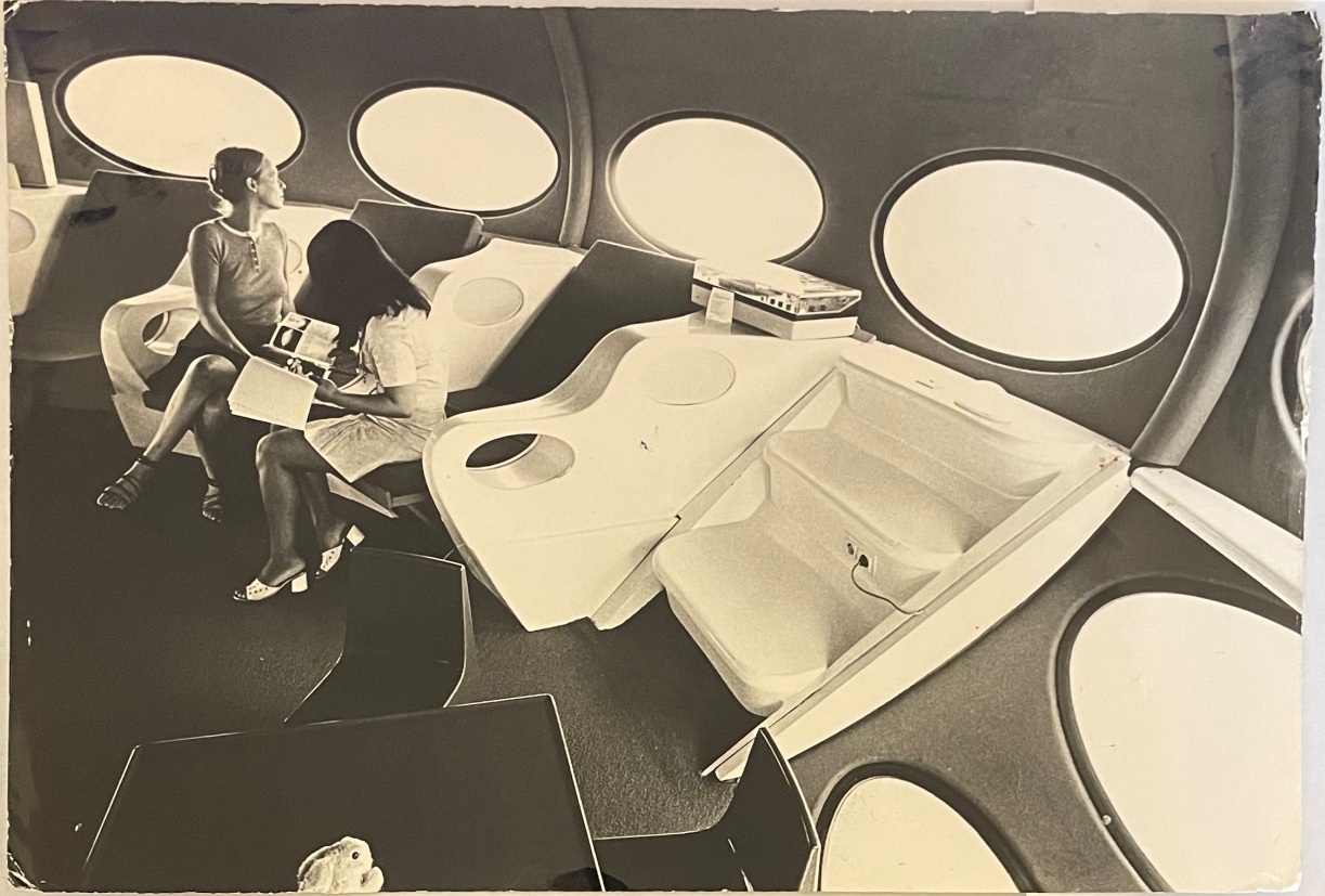 This photo is of the interior of the Futuro House that was one of the many structures exhibited at the IKA.