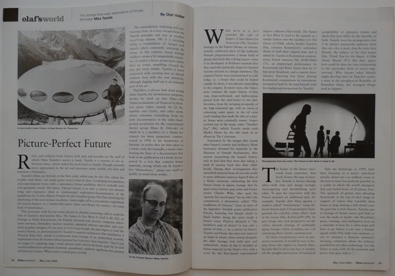 Mika Taanila's work. The article is titled "Picture-Perfect Future" and sub-titled "The strange time-warp explorations of Finnish filmmaker Mika Taanila". Among the works reviewed is the iconic documentary